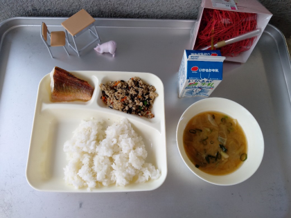 今日の献立は「あかうおのレモンじょうゆかけ、みそ汁、高野どうふのいり煮、ごはん、牛乳」でした。