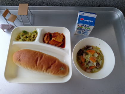 今日の献立は「ポトフ、カレーソテー、焼きプリン、レーズンパン、牛乳」でした。