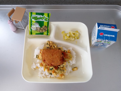 今日の献立は、「カツ丼、はくさいのゆず風味、まっ茶大豆、牛乳」でした。