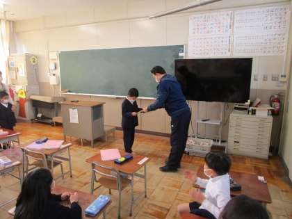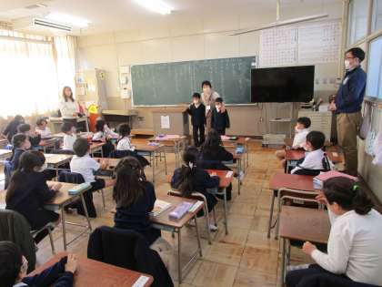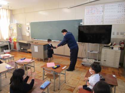 1年生の様子です。校内で指導していました「日本語指導」の授業が最終日を迎えました。1年生で2名の子どもたちが学んでいました。今日は最終日ということもあり、教室に戻って、学習の成果を友だちに聞いてもらうことができました。大変立派でした。校長先生から修了証が授与されました。