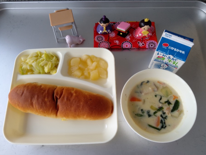 今日の献立は「ほうれんそうのクリームシチュー、キャベツのサラダ、洋なし(缶)、おさつパン、牛乳」でした。