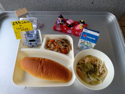 今日の献立は「豚肉とごぼうの煮もの、なにわうどん、固形チーズ、コッペパン、ブルーベリージャム、牛乳」でした。