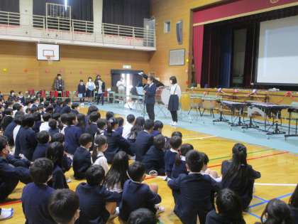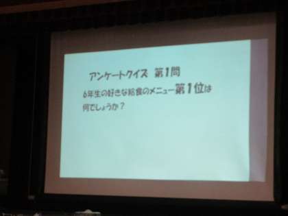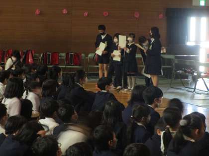 講堂では縦割り班で集合しました。6年生にしがみついている1年生の姿が印象的でした。委員会の子どもたちが考えた問題をスクリーンに映してクイズを行いました。
