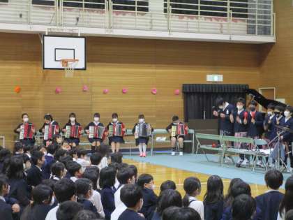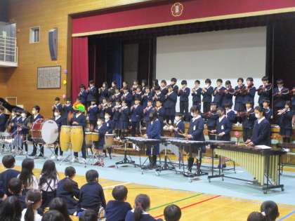 6年生からは1年生から5年生に向けて合奏を披露してくれました。先日の学習参観で演奏した「アフリカンシンフォニー」です。学習参観の時よりもいっそう一体感があり、素晴らしい演奏に子どもたちは一生懸命聴き入っていました。今日のような場で音楽を通じて会場が一つになることができるのは大切なことだとあらためて実感しました。