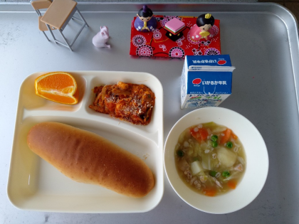 今日の献立は「とうふのミートグラタン、押麦と野菜のスープ煮、デコポン、黒糖パン、牛乳」でした。