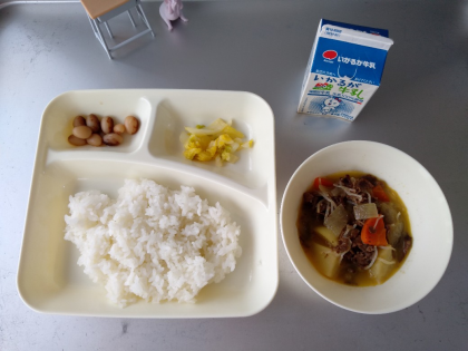 今日の献立は「肉じゃが、はくさいのゆず風味、とら豆の煮もの、ごはん、牛乳」でした。
