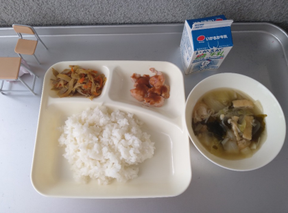 今日の献立は「鶏肉のみそバターソース、五目汁、きんぴらごぼう、ごはん、牛乳」でした。