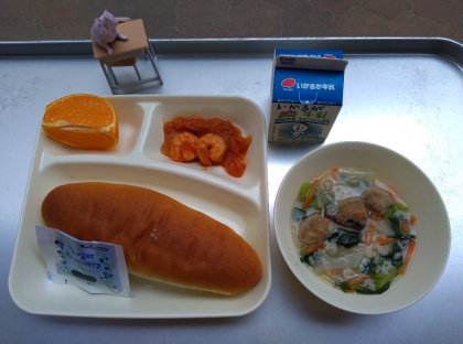 今日の献立は「えびのチリソースいため、中華がゆ、デコポン、コッペパン、ブルーベリージャム、牛乳」でした。