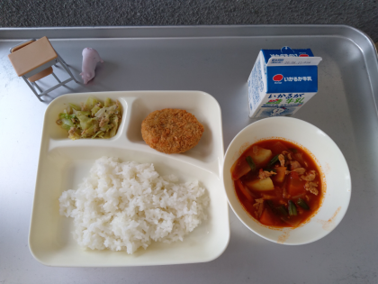 今日の献立は「チキンレバーカツ、ケチャップ煮、ツナとキャベツのバジルソテー、ごはん、牛乳」でした。