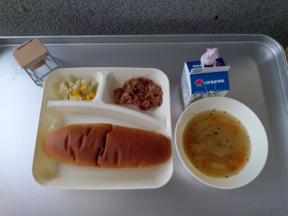 3学期最後の給食は「豚肉のデミグラスソース、スープ、カリフラワーとコーンのサラダ、黒糖パン、牛乳」でした。