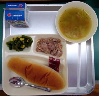 今日の献立は「豚肉のガーリック焼き、スープ、さんどまめとコーンのサラダ、コッペパン、いちごジャム、牛乳」でした。