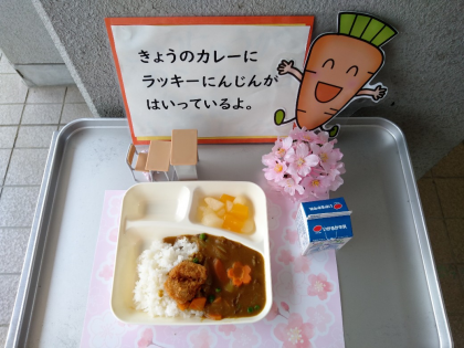 今日は、入学祝い献立で「カツカレーライス、フルーツゼリー、牛乳」でした。