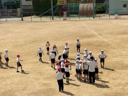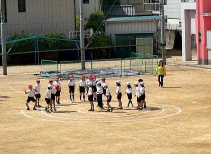 3年2組は体ほぐしの運動で「うずまきジャンケン」を行っていました。線をよく見てはみ出さないこと、友だちとぶつからないことに注意して楽しみました。
