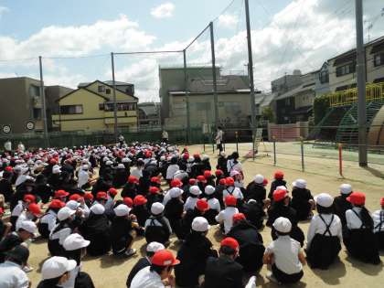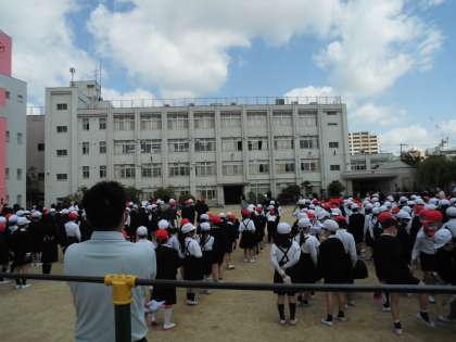 それぞれハンカチなどを口元にあてながら、ほとんどの児童が真剣な表情でスムーズに避難することができました。児童の大切ないのちを守るために、とても重要な取り組みです。いざという時のために、反省をしっかりと次につないでいきたいと思います。