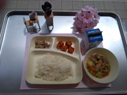 今日の献立は「まぐろのオーロラ煮、豚肉と野菜の煮もの、キャベツの赤じそあえ、ごはん、牛乳」でした。