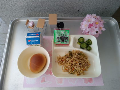 今日の献立は「焼きそば、きゅうりのしょうがづけ、ソフト黒豆、1/2黒糖パン、牛乳」でした。