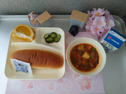 今日の献立は「ビーフシチュー、きゅうりのサラダ、あまなつかん、コッペパン、ブルーベリージャム、牛乳」でした。