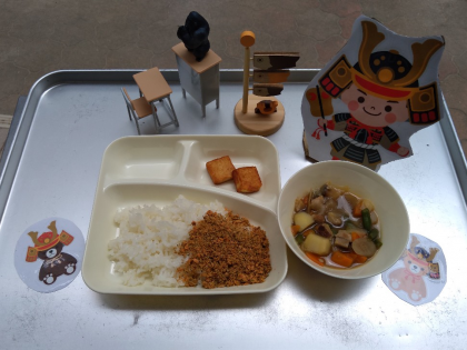 今日の献立は「豚肉とじゃがいもの煮もの、あつあげのしょうゆだれかけ、紅ざけそぼろ、ごはん、牛乳」でした。