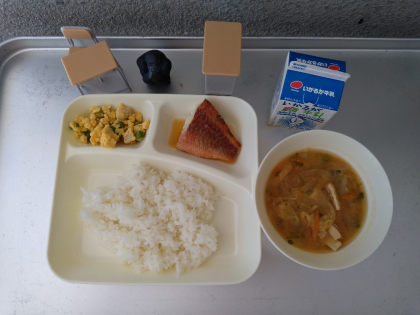 今日の献立は「あかうおのしょうゆだれかけ、みそ汁、えんどうの卵とじ、ごはん、牛乳」でした。