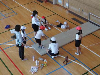 体育館での立ち幅跳びでは、測定だけではなく、跳び方をレクチャーしていました。足で踏ん張る立ち幅跳びですが、実は腕の振りがとても重要です。当然1年生には難しいのですが、隣に立って一緒に腕を振って声をかけているおかげで、1年生はしっかりと跳ぶことができていました。それを支えている6年生の姿は、本当に素敵です!