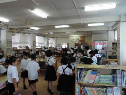 今日はあいにくの天気だということもあり、図書館に多くの児童が訪れていました。図書委員会の高学年児童が、学校図書館補助員さんと一緒に本の貸し借りなど、てきぱきと対応する姿は立派でした。