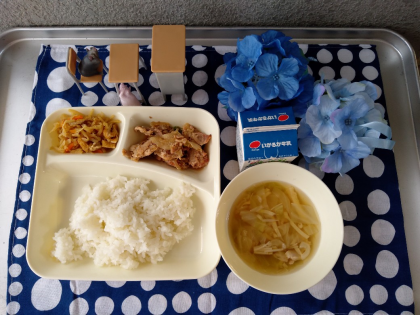 今日の献立は「豚肉のごまみそ焼き、すまし汁、切干しだいこんのいため煮、ごはん、牛乳」でした。
