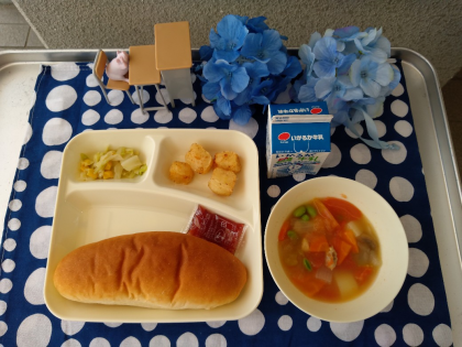 今日の献立は「いかてんぷら、フレッシュトマトのスープ煮、キャベツとコーンのソテー、コッペパン、いちごジャム、牛乳」でした。