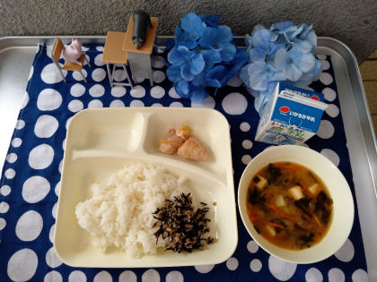 今日の献立は「鶏肉のおろしじょうゆかけ、みそ汁、魚ひじきそぼろ、ごはん、牛乳」でした。