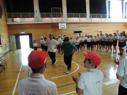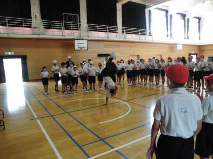 講師にB-Boy KakuさんとアシスタントにYooさんをお招きしてのBreakDanceの授業です。Kakuさんの軽妙なおしゃべりと紹介VTRで始まった講座ですが、実際2人のDanceを目の当たりにすると、子どもたちは大興奮!やる気満々でDanceに取り組みました。世界大会に出るような本物のDancerを見ることができ、本当に素敵な時間でした。