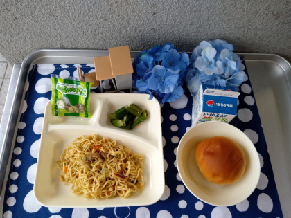 今日の献立は「和風焼きそば、オクラの甘酢あえ、まっ茶大豆、1/2黒糖パン、牛乳」でした。