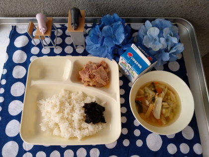 今日の献立は「豚肉の甘辛焼き、五目汁、のりのつくだ煮、ごはん、牛乳」でした。