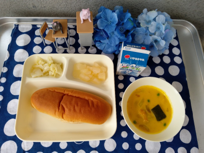 今日の献立は「かぼちゃのクリームシチュー、キャベツのゆずドレッシング、和なし(缶)、黒糖パン、牛乳」でした。
