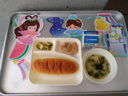 今日の献立は「鶏肉のからあげ、とうがんの中華スープ、ツナとチンゲンサイのいためもの、おさつパン、牛乳」でした。