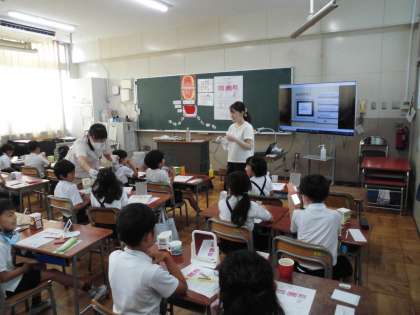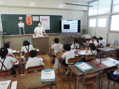 2年生の歯磨き指導に、歯科衛生士さんお2人に来ていただきました。動画やワークシートを使って、丁寧な説明をしていただきながら取り組みました。児童は真剣な表情で歯についた汚れを歯ブラシで落とし、自分の磨き方を確かめていました。歯磨きの必要性を理解し、実践するよい機会となりました。