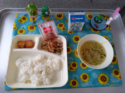 今日の献立は「ゴーヤチャンプルー、五目汁、あつあげのしょうがじょうゆかけ、ごはん、牛乳」でした。