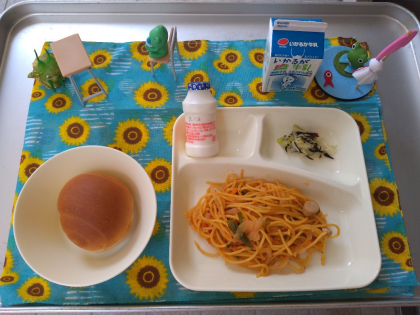 今日の献立は「チキントマトスパゲッティ、キャベツのひじきドレッシング、発酵乳、1/2黒糖パン、牛乳」でした。