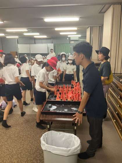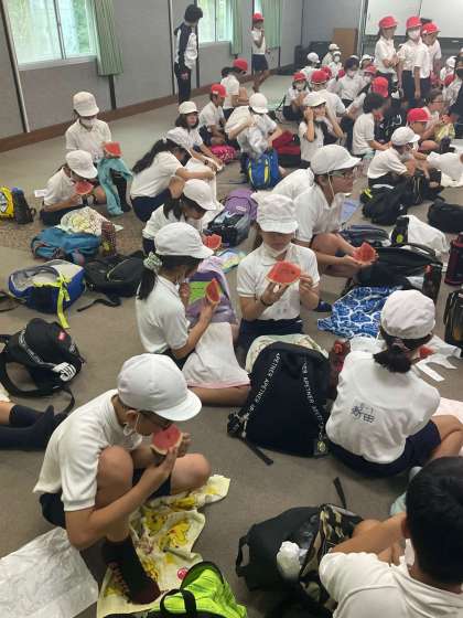 変わりやすい山の天気で、急な夕立に合い、広場でなく多目的ホールでいただきました。