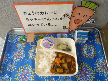 今日の献立は「ビーフカレーライス〔米粉」、野菜のピクルス、ぶどうゼリー、牛乳」でした。