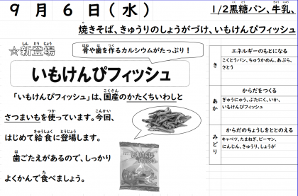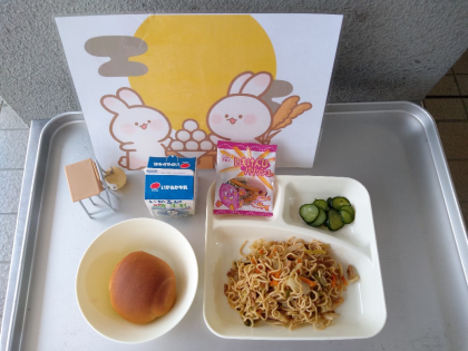 今日の献立は「焼きそば、きゅうりのしょうがづけ、いもけんぴフィッシュ、1/2黒糖パン、牛乳」でした。