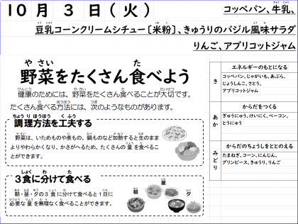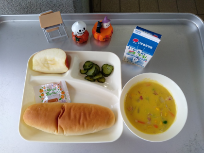 今日の献立は「豆乳コーンクリームシチュー(米粉)、きゅうりのバジル風味サラダ、りんご、コッペパン、アプリコットジャム、牛乳」でした。