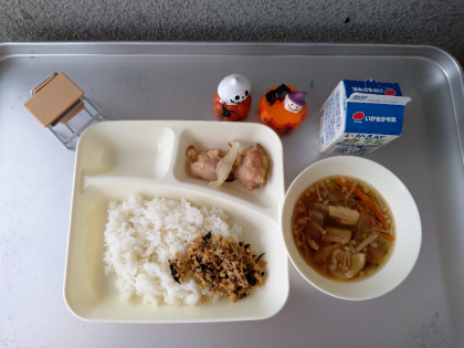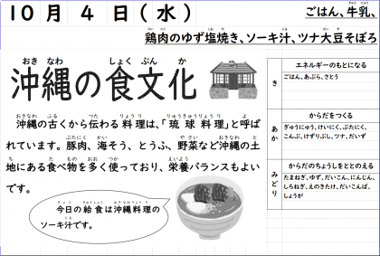 今日の献立は「鶏肉のゆず塩焼き、ソーキ汁、ツナ大豆そぼろ、ごはん、牛乳」でした。