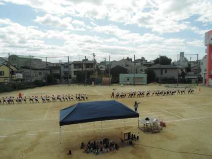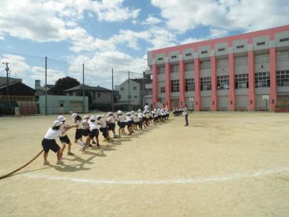 3年生の運動会練習に大繩が登場しました。今年度は団体競技を実施するため、3年生が取り組んでいるのですが、いかにも運動会!という雰囲気が出るように思います。綱引きそのものは日常生活であまり経験することのない、全力で何かを引くという運動になります。学習指導要領体育編にある体つくり運動における「力試しの運動」として例示されているものです。コロナ架においては取り組みづらかったものですが、児童に身につけてほしい動きです。