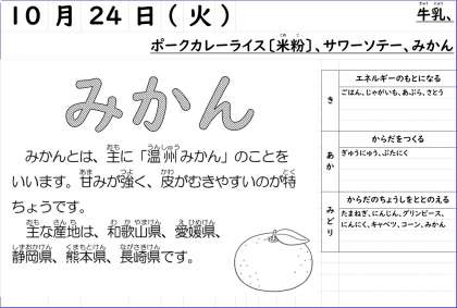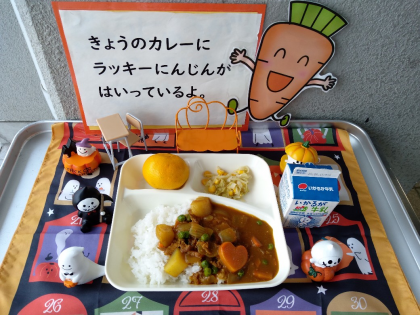 今日の献立は「ポークカレーライス(米粉)、サワーソテー、みかん、牛乳」でした。