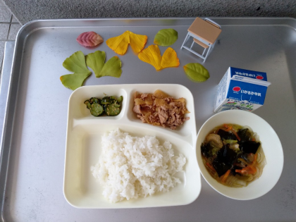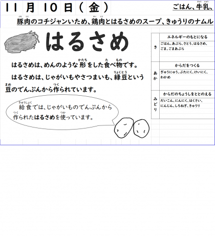 今日の献立は「豚肉のコチジャンいため、鶏肉とはるさめのスープ、きゅうりのナムル、ごはん、牛乳」でした。