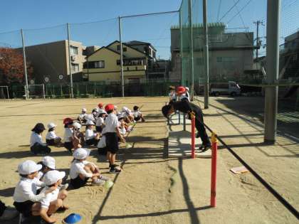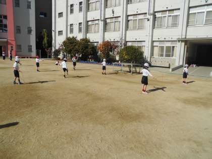寒くはなってきましたが、快晴の天気のもと、1年生は運動場で体育科の授業をがんばりました。短なわでの前回し跳びも、やれば当たり前にできるのではなく、リズミカルに両足で踏み切って跳ぶことや、腕全体ではなく手首でなわを回すことができることなど、スモールステップが存在します。鉄棒もそうですが、まだまだ運動遊びの段階です。楽しみながらいろいろな動きを経験してほしいと思います。