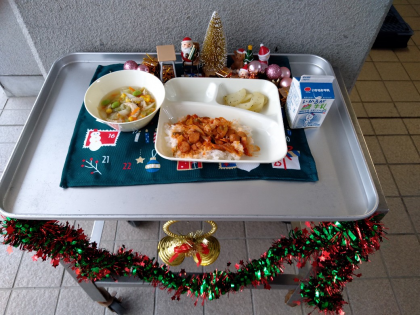 今日の献立は「ケチャップライス、スープ、じゃがいものバジル焼き、牛乳」でした。