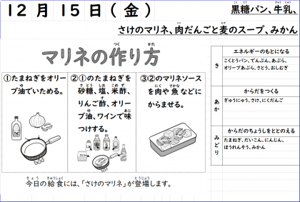今日の献立は「さけのマリネ、肉だんごと麦のスープ、みかん、黒糖パン、牛乳」でした。