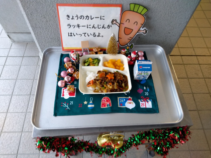 今日の献立は「冬野菜のカレーライス、ブロッコリーとコーンのサラダ、黄桃(缶)、牛乳」でした。