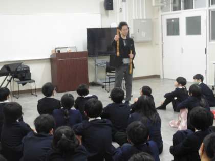 今日は6年生が音楽鑑賞として、尺八の演奏を聞きました。本校の卒業生であり、保護者であった方が、本校教員と一緒に演奏し、実現しました。お正月におなじみの「春の海」を聞いたり、尺八という楽器について教えてもらったりしながら、児童にとって貴重な経験をすることができた時間でした。