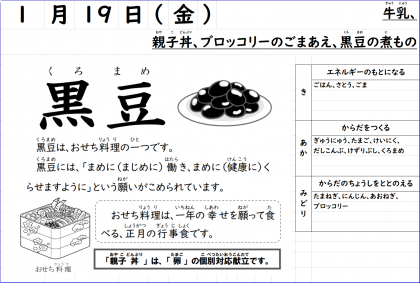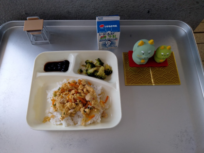 今日の献立は「親子丼、ブロッコリーのごまあえ、黒豆の煮もの、牛乳」でした。